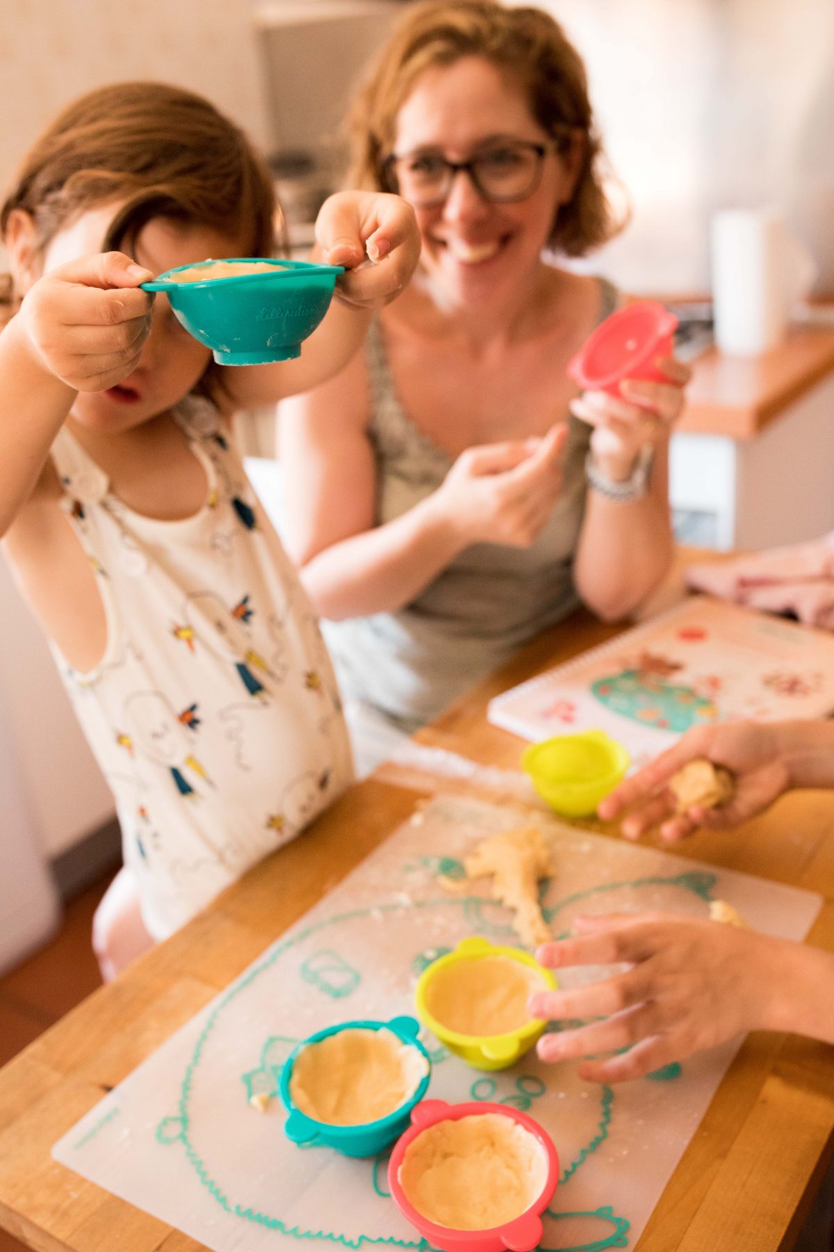 Utilizamos el mantel de silicona para cocinar, pero después puede usarse para el horno perfectamente, protege las fuentes y es más fácil de limpiar. El libro de recetas, también de la marca Lilliputiens tiene recetas adaptadas para peques y son bastante creativas. Además tiene las páginas plastificadas para poder tener sobre la mesa mientras cocinan y limpiarlo después (fundamental). Los moldes de silicona también son aptos para horno y muy fáciles de usar.